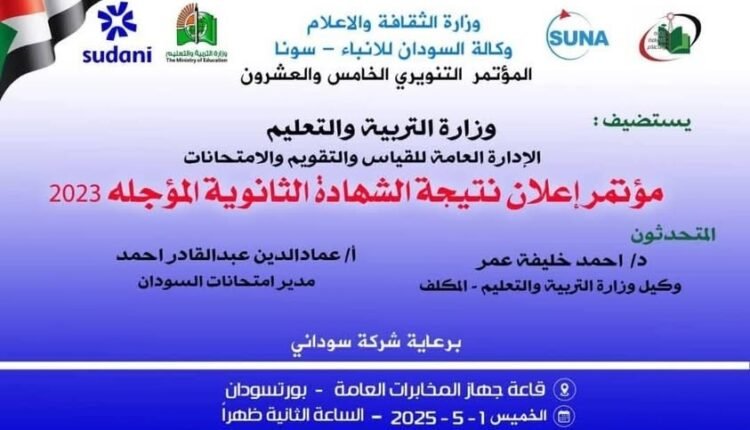 تُعلن وزارة التربية والتعليم السودانية، في تمام الساعة الثانية من ظهر اليوم الخميس، نتيجة امتحانات الشهادة السودانية للدورة المؤجلة للعام 2023م، وذلك عبر بث مباشر على شاشة تلفزيون السودان.