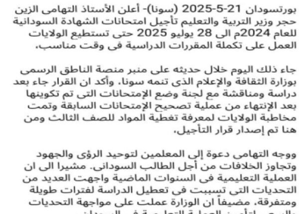 وبحسب بيان صادر عن اللجنة، فإن القرار جاء عبر تصريح رسمي لوزير التربية الاتحادي نُشر في منصة الناطق الرسمي باسم وزارة الثقافة، الذي أشار فيه إلى أن التأجيل يهدف إلى إتاحة الفرصة للولايات لاستكمال المقررات الدراسية، وأنه تم بالتشاور مع الجهات ذات الصلة.