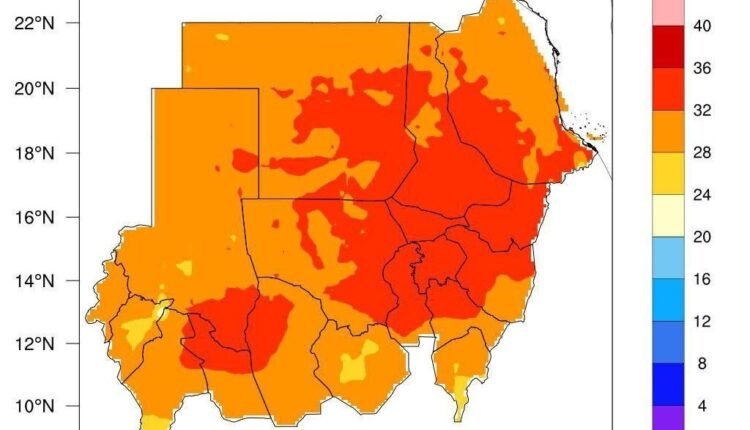 أما درجات الحرارة المرتفعة التي تتراوح بين 32 و36 درجة مئوية، فمن المتوقع أن تسجلها مناطق جنوب وغرب البحر الأحمر، معظم نهر النيل، شرق الشمالية، كسلا، الخرطوم، الجزيرة، شمال غرب القضارف، شمال سنار، معظم النيل الأبيض، غرب شمال كردفان، غرب غرب كردفان، شمال شرق دارفور، وأقصى جنوب شرق شمال دارفور وأقصى شمال شرق جنوب دارفور.