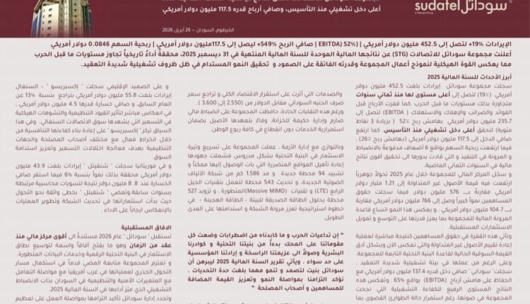 أعلنت مجموعة سوداتل للاتصالات تحقيق نتائج مالية قياسية خلال السنة المالية 2025، مسجلة أعلى دخل تشغيلي منذ تأسيسها، وصافي أرباح بلغ 117.5 مليون دولار، في أداء يعكس قدرتها على الصمود والنمو رغم الظروف الاستثنائية في السودان.
