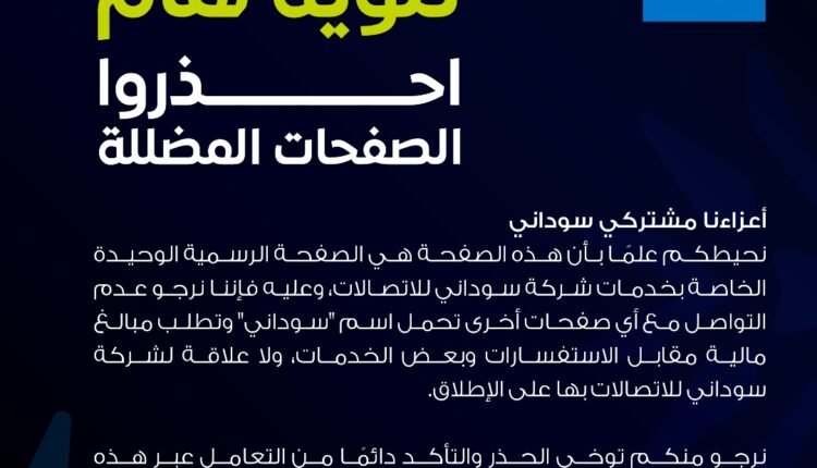 نحيطكم علمًا بأن هذه الصفحة هي الصفحة الرسمية الوحيدة الخاصة بخدمات شركة سوداني للاتصالات، وعليه فإننا نرجو عدم التواصل مع أي صفحات أخرى تحمل اسم “سوداني” وتطلب مبالغ مالية مقابل الاستفسارات وبعض الخدمات، ولا علاقة لشركة سوداني للاتصالات بها على الإطلاق.